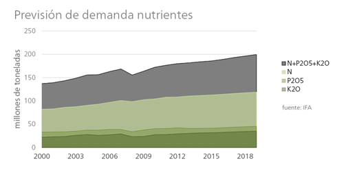 Los principales impulsores del consumo de fertilizantes a largo plazo son el crecimiento demográfico, que conlleva un incremento en la ingesta de alimentos, y el aumento de los niveles de ingresos, que promueve la mejora de la calidad. Las previsiones de CRU, al igual que las de IFA (International Fertilizer Industry Association), estiman incrementos en el consumo de nitrógeno, fósforo y potasio.